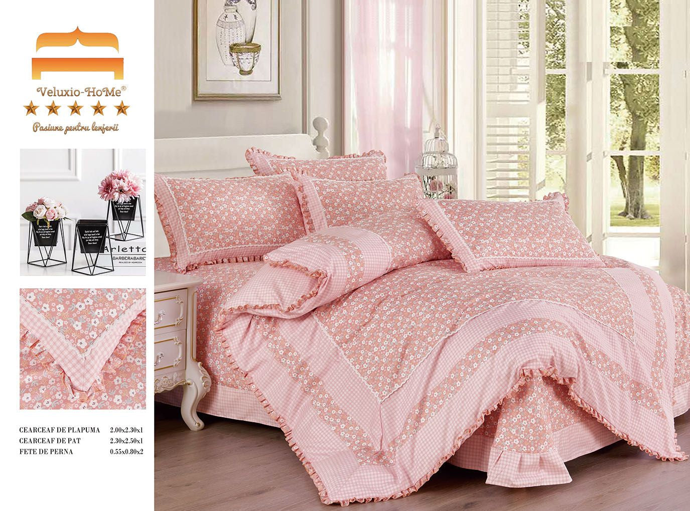 Lenjerie Bumbac Finet Premium 4 Piese cu Volanase, Roz/Floricele-M4661