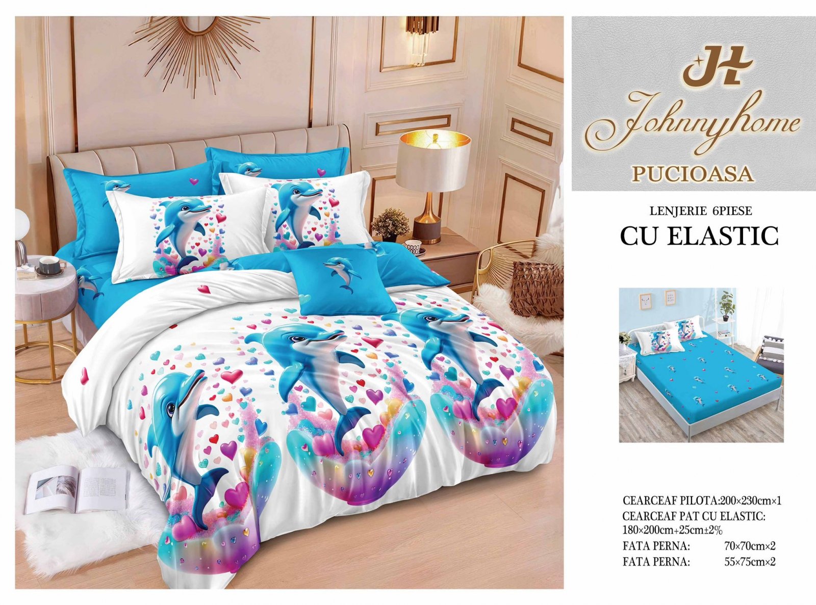 Lenjerie de Pat Finet 6 Piese cu Elastic, Delfini/Inimioare-H7633