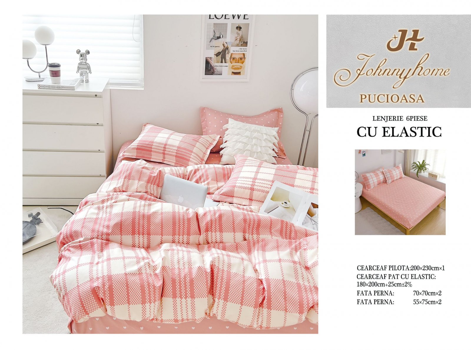 Lenjerie de Pat Finet 6 Piese cu Elastic, Roz/Carouri-H6148