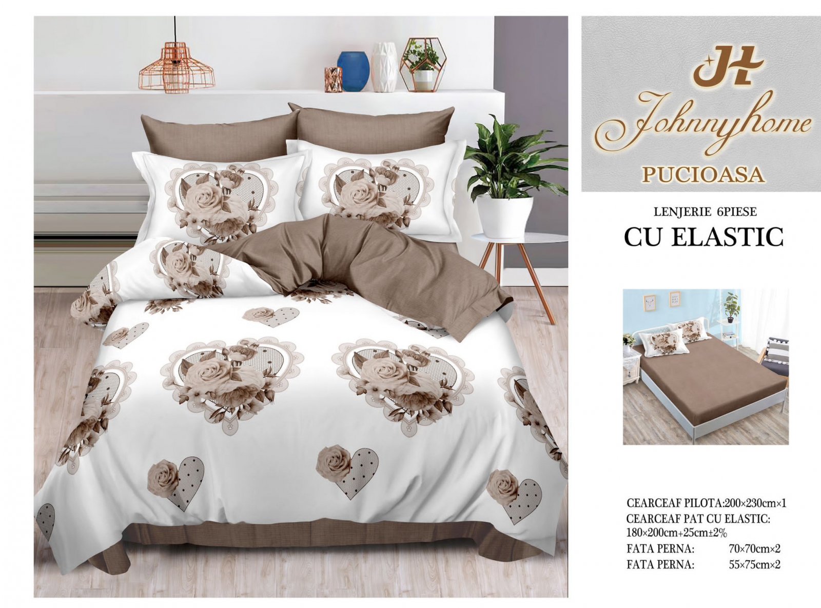Lenjerie de Pat Finet 6 Piese cu Elastic, Trandafiri/Inimi-H6084