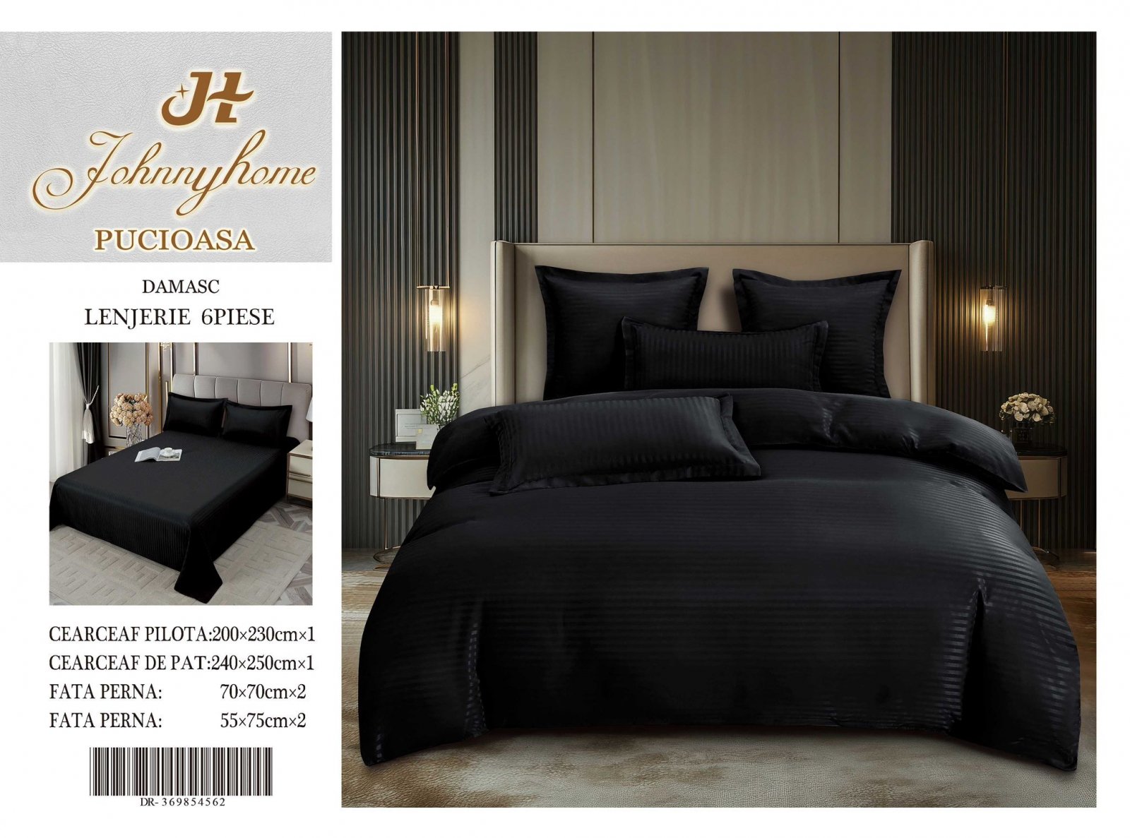 Lenjerie Pat Dublu din Bumbac Damasc, 6 Piese, Negru-H8296
