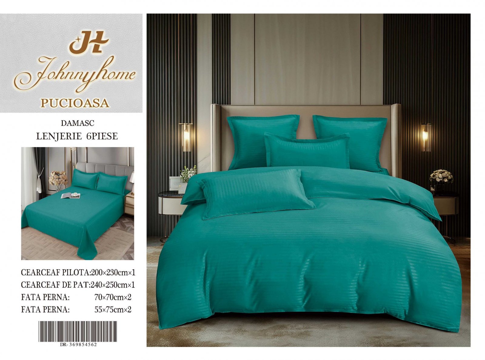 Lenjerie Pat Dublu din Bumbac Damasc, 6 Piese, Turcoaz-H8298