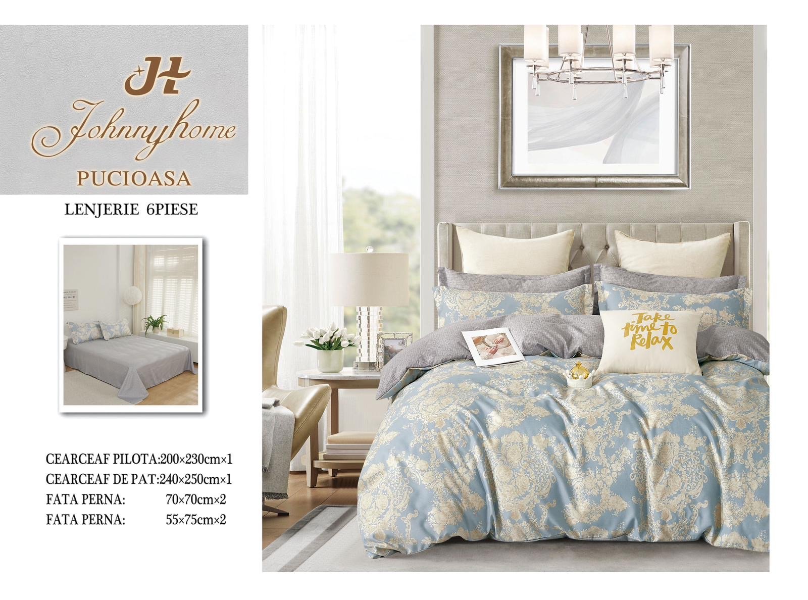 Lenjerie Pat Dublu din Finet, 6 Piese, Bleu/Floricele-H7666