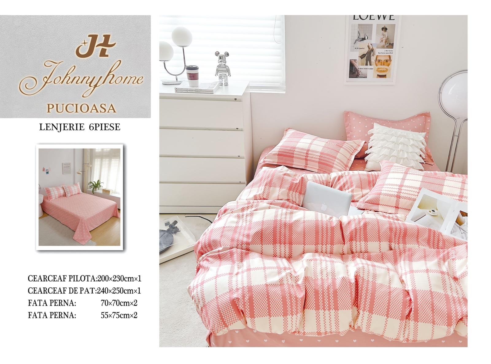 Lenjerie Pat Dublu din Finet, 6 Piese, Dungi Roz-H7674