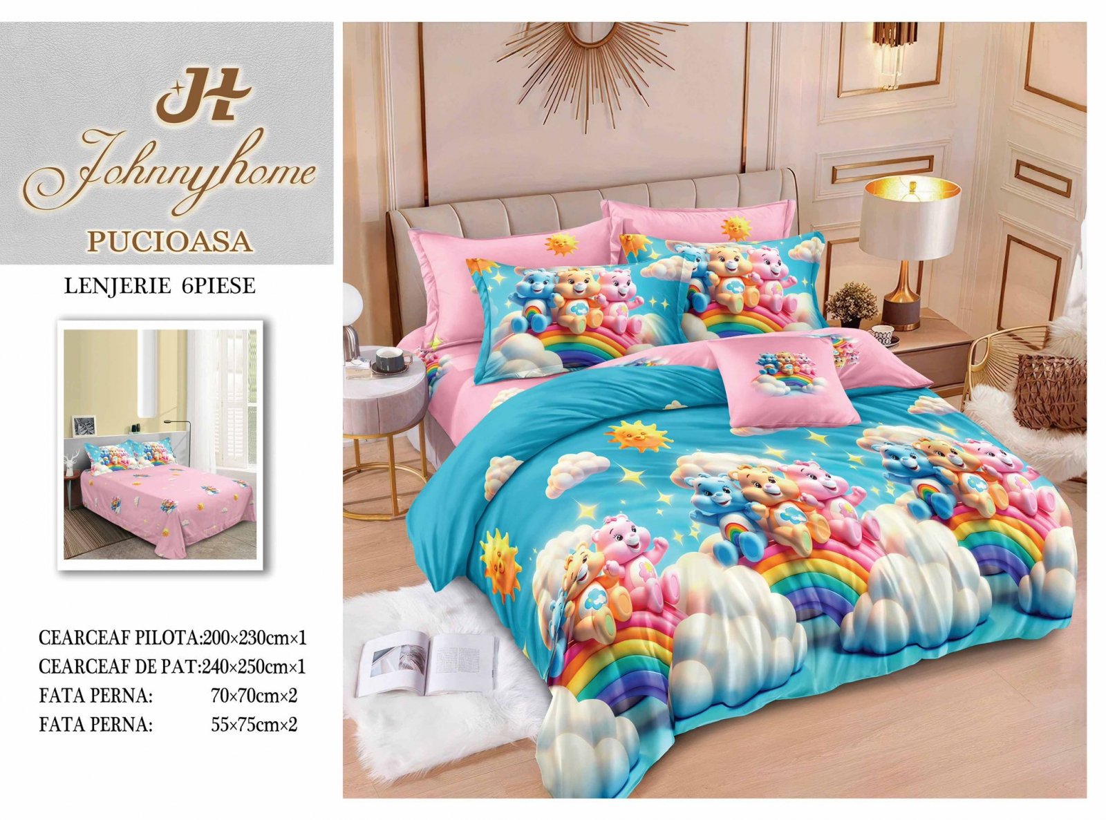 Lenjerie Pat Dublu din Finet, 6 Piese, Ursuleti/Curcubeu-H7690